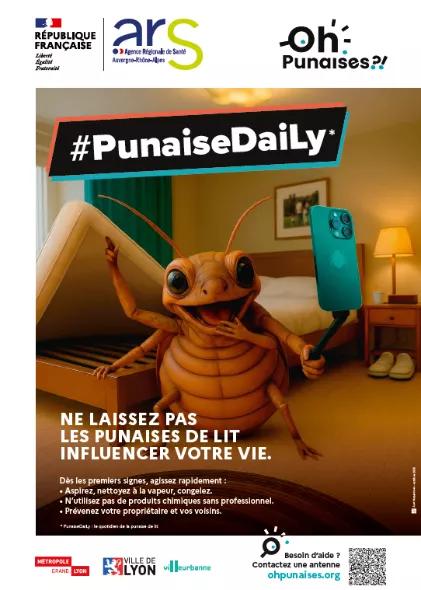 La campagne #PunaisesDaiLy est incarnée par une punaise de lit influenceuse qui partage ses bons plans pour s’incruster chez les humains. On suit ainsi la punaise de lit dans son quotidien et ses spots préférés : chambre, meuble récupéré dans la rue ou encore sac de voyage. Pour chaque visuel, des recommandations simples à mettre en œuvre sont données, autour du slogan : « Ne laissez pas les punaises influencer votre vie. » Un QR code permet de renvoyer vers plus de conseils, notamment un guide complet : comment éviter une infestation ? comment s’en débarrasser ? etc.