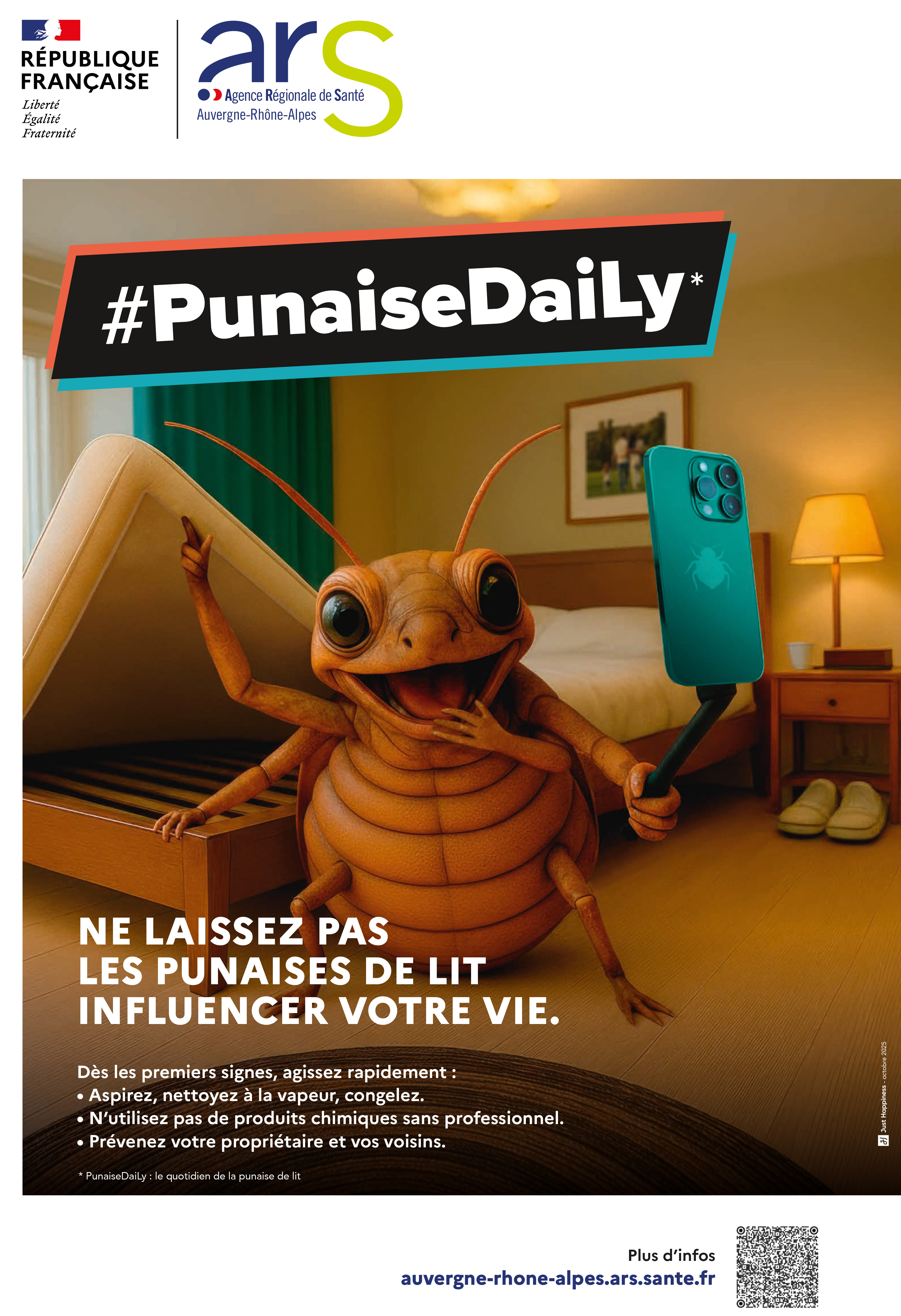 La campagne est incarnée par #PunaiseDaily, une punaise de lit influenceuse qui partage ses bons plans pour s’inviter chez les humains. On suit ainsi la punaise de lit dans son quotidien et ses spots préférés : chambre, meuble récupéré dans la rue ou encore sac de voyage.